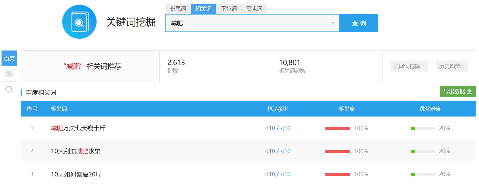 第三方工具的一個優勢是會集成顯示很多相關數據,如百度指數、收錄數等,有的還顯示工具平臺計算出來的優化難度(也就是競爭指數)和推薦度(也就是潛在效能)。