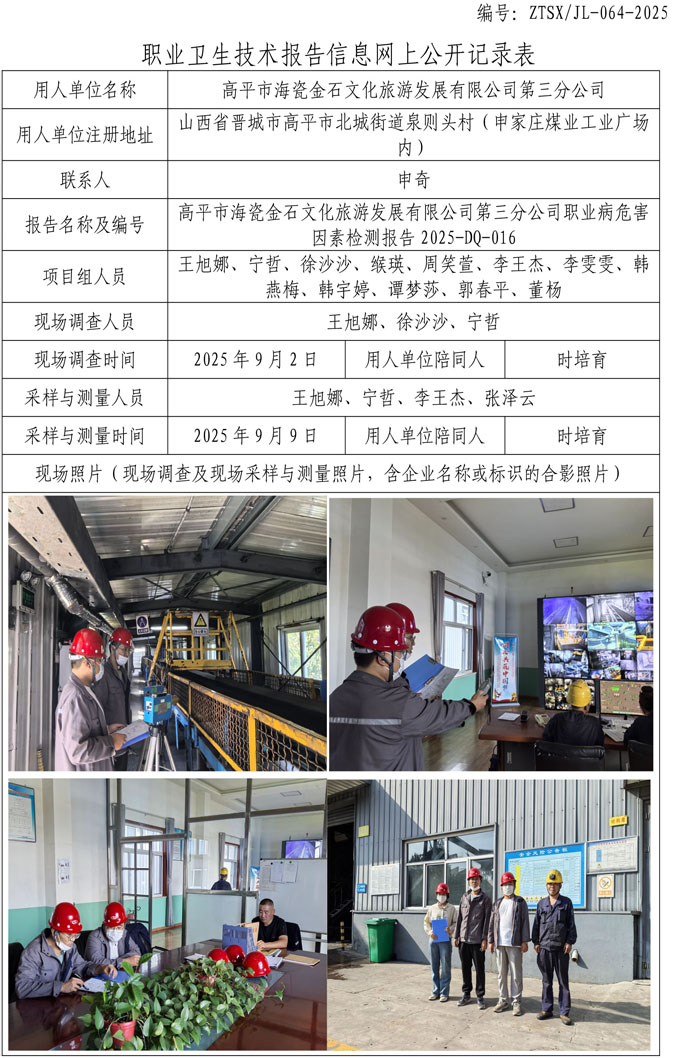 高平市海瓷金石文化旅游發(fā)展有限公司第三分公司職業(yè)病危害因素檢測網(wǎng)上公開信息