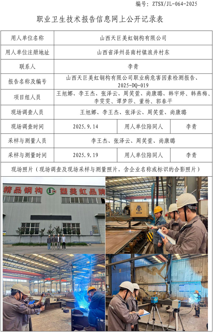 山西天巨美虹鋼構有限公司職業(yè)病危害因素檢測網(wǎng)上公開信息